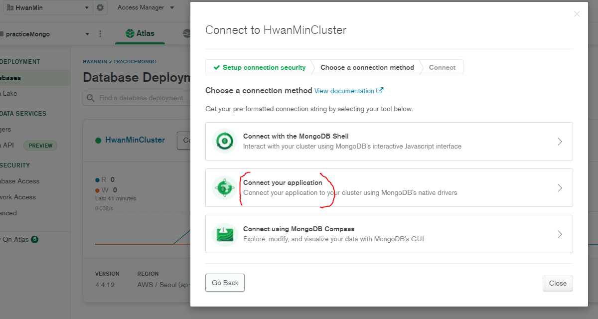 1. 몽고디비 설치 및 연결 npm init npm i mongoose config / db.js 파일 생성 const connectDB = async () => { try { const conn = await mongoose.connect(process.env.MONGO_URI) console.log(`MongoDB Connected : ${conn.connection.host}`.cyan.underline); } catch (error) { console.log(error); process.exit(1); } } module.exports = connectDB; process.env.MONGO_URI 는 MongoDB 홈페이지에서 프로젝트랑 데이터베이스를 만들었으면 CONNECT가 활성되어 있을텐데 ..
